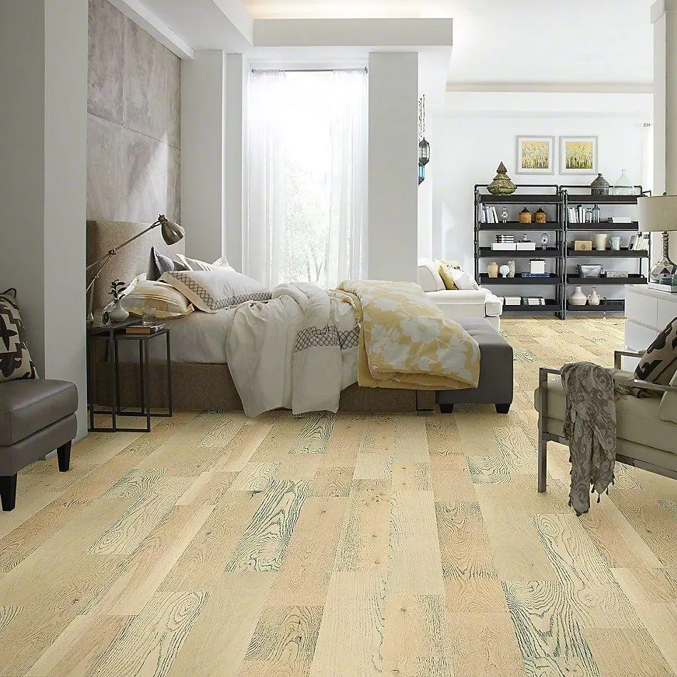 New yellow themed hardwood flooring and installation in a bedroom scene from Flooring Direct.